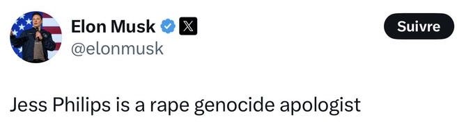 Jess Phillips is not to everyone's taste, to say the least, but she has dedicated her political career to the victims of violence against women. Her record of public service is one of action, not rhetoric. Musk's smears come at a time when politicians like Phillips are already subject to a barrage of online rape and death threats. Two sitting MPs have been murdered in recent years. To disagree with Phillips is one thing, to single her out for opprobrium in this way is quite another.